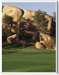 A very unique golf course resides just east of Payson about 75 minutes northeast of Scottsdale and Phoenix. Located in the heart of the largest stand of Ponderosa Pines anywhere, between the Mogollon Rim, the Stewart Mountains and the Granite Dells, is The Rim Golf Club. This 555-acre private community has 326 estate home sites ranging from a one-half to 1.5 acres. Their plan is to keep half of the acreage in its natural state to preserve the beauty and tranquility of the setting. Hardly anyone from the city would think that this much beauty could exist in Arizona; you would more likely think you were in the Sierra Mountains. Opening in 1999 and designed by Tom Weiskopf and Jay Morrish, this par-71 golf course plays to 7193 yards. The Rim Golf Club continues its multi-year, very high ranking by Golfweek Magazine placing 24 in the 2012 America’s Best Residential Courses, and 66th in the 2012 America’s Best 100 courses built since 1960 (the Modern era). This course features spectacular boulder outcroppings, dramatic elevation changes, wondrous views of the Mogollon Rim, and scenic mountains to the South. Water is on six holes, with dry streams bisecting some of the fairways. You will be accompanied by the fresh smell of pine all during your round. Playability is the hallmark of The Rim Golf Club, with year-round enjoyment for players of all abilities. Fairways might look more challenging than they really are, but most holes have generous landing areas. The topography of the course will test you; however, if you don’t get completely caught-up with the views and do make good use of the guide book provided, you should score well. Starting with your opening tee shot on “The Rim”, you know you are in for a wonderful day. A good tee shot from an elevated tee to a forgiving bowl-shaped fairway will leave a short shot into a well-protected green. You’re now through with the easy part.